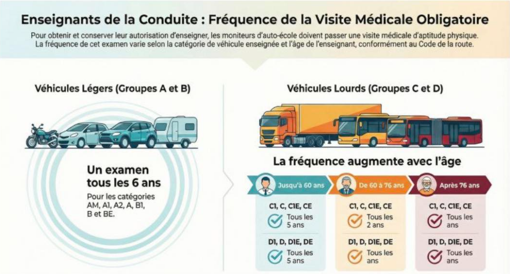 • L’enseignement de la conduite des véhicules des catégories C1, C, C1E et CE, tous les cinq ans jusqu’à l’âge de soixante ans, tous les deux ans de soixante à soixante-seize ans ; tous les ans à compter de soixante-seize ans ;